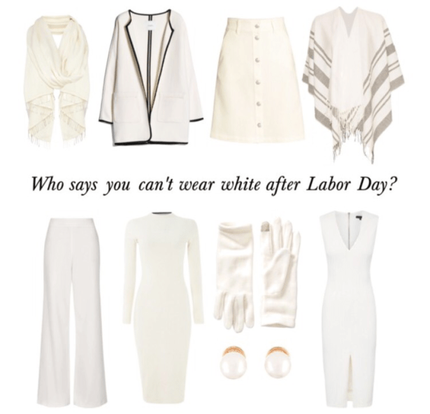 Below I’ve pulled together some of my favorite whites to wear after Labor Day. Adding a white scarf or gloves can spice up that dull wool coat this Winter. The white dresses are perfect for Fall and Winter. Throw on a pair of tights and brown riding boots and you’ll look perfect for Fall. Spice up the holiday parties with high waisted flare pants or a white dress. While others will default to the LRD you can stand out in white.