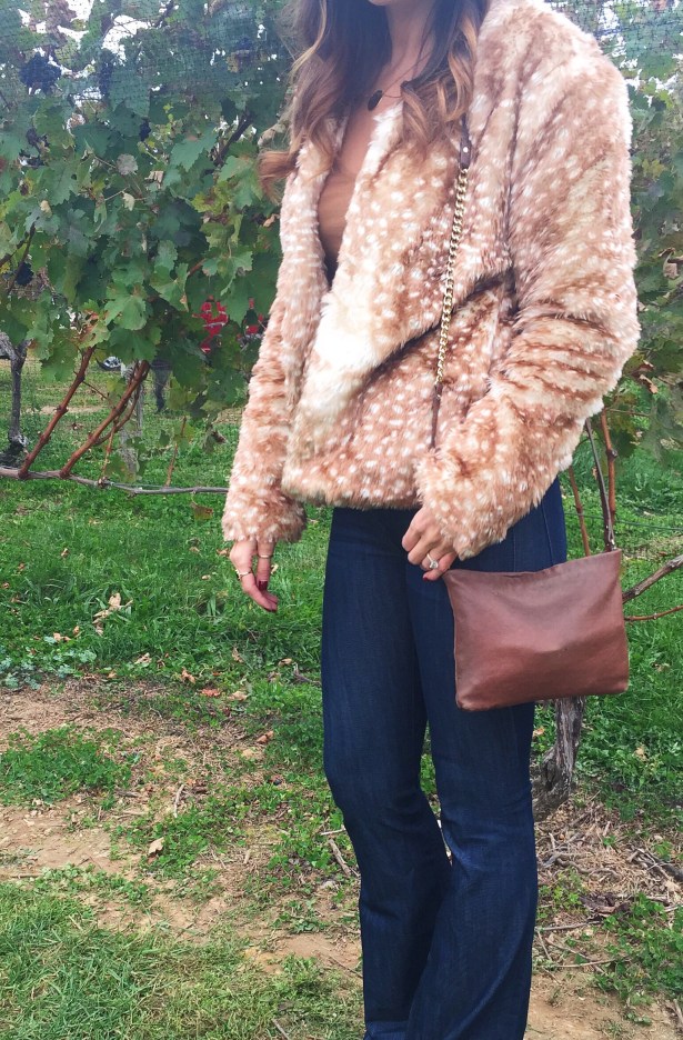 It was love at first faux. Thank goodness it’s faux fur because I couldn’t live with myself if I was just strutting around wearing Bambi. This Mink Pink Oh Deer Beige Faux Fur coat is a Fall staple. Perfect for any occasion, especially wine tasting in upstate New York.