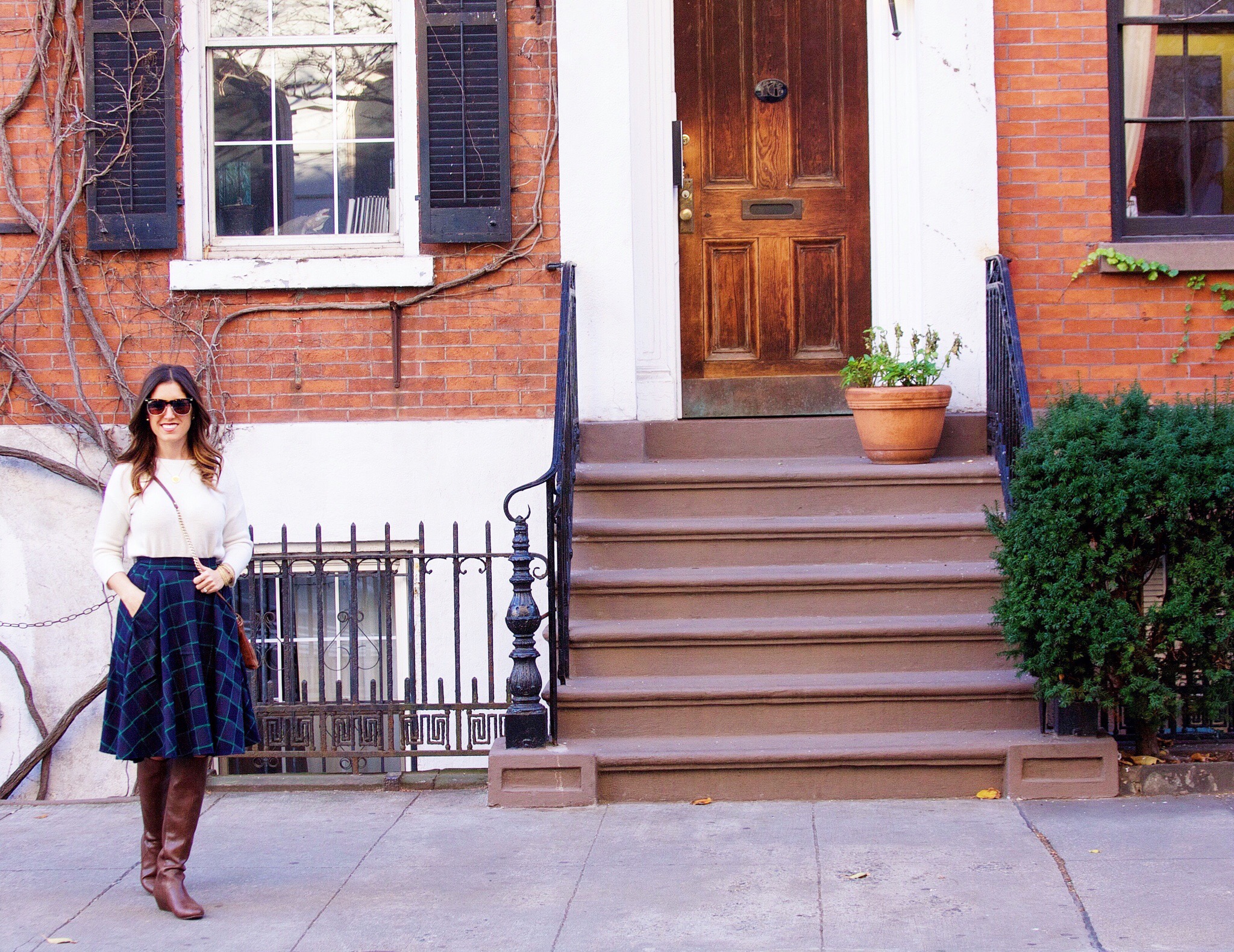 I went the classy route with a nice Sheinside green plaid midi skirt and knee high flat boots. Flats are key. If you like me and hovering over the apps for the first hour you want comfy shoes to stand in. I am OBSESSED with my Jessica Simpson Joline 50/50 boots. I paired the shirt with a three quarter length sweater. It’s simple and classy. Oh, and did I mention the plaid skirt has an elastic waist band. Haha…I came ready to stuff my face.