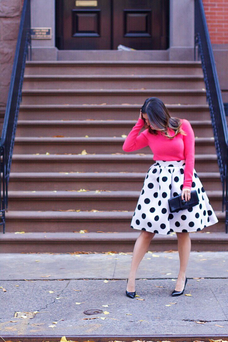 When your birthday comes around it’s important to have the perfect birthday outfit. Don’t lie, y’all think about it. I had the most fun skipping around the streets in this fabulous polka dot midi skirt. I didn’t know if I felt like a Stepford wife or a birthday girl. Ha! I paired this skirt with a hot pink sweater and my standard pumps. If you’re looking for a midi skirt that maintains the poof this is the perfect skirt for you.