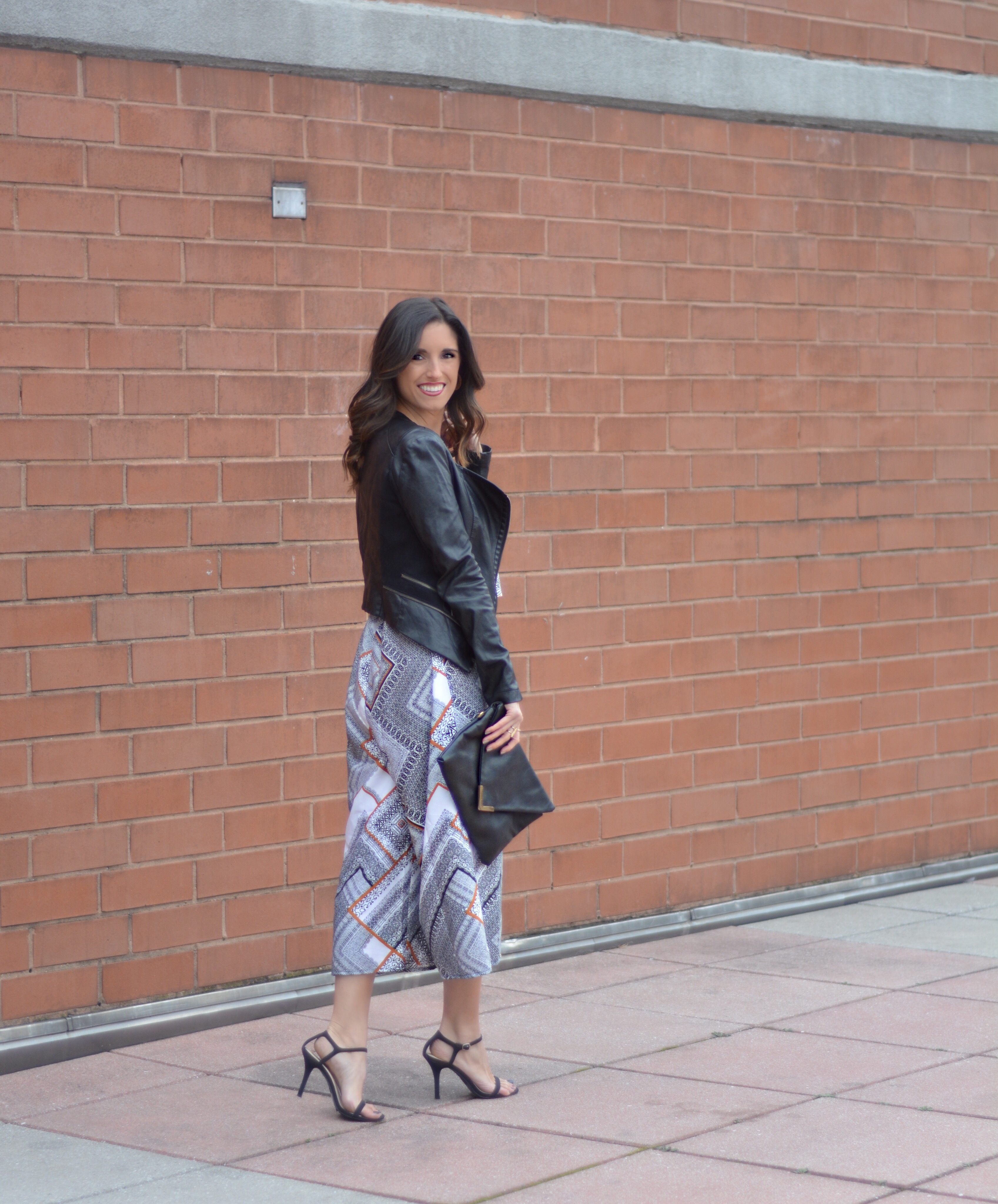 Culotte Jumpsuits | Strappy heels: Similar here and here| Faux Leather Jacket: Similar here | Stella and Dot Necklace | Double Wrap Tory Burch for Fitbit | Black Clutch: Similar here