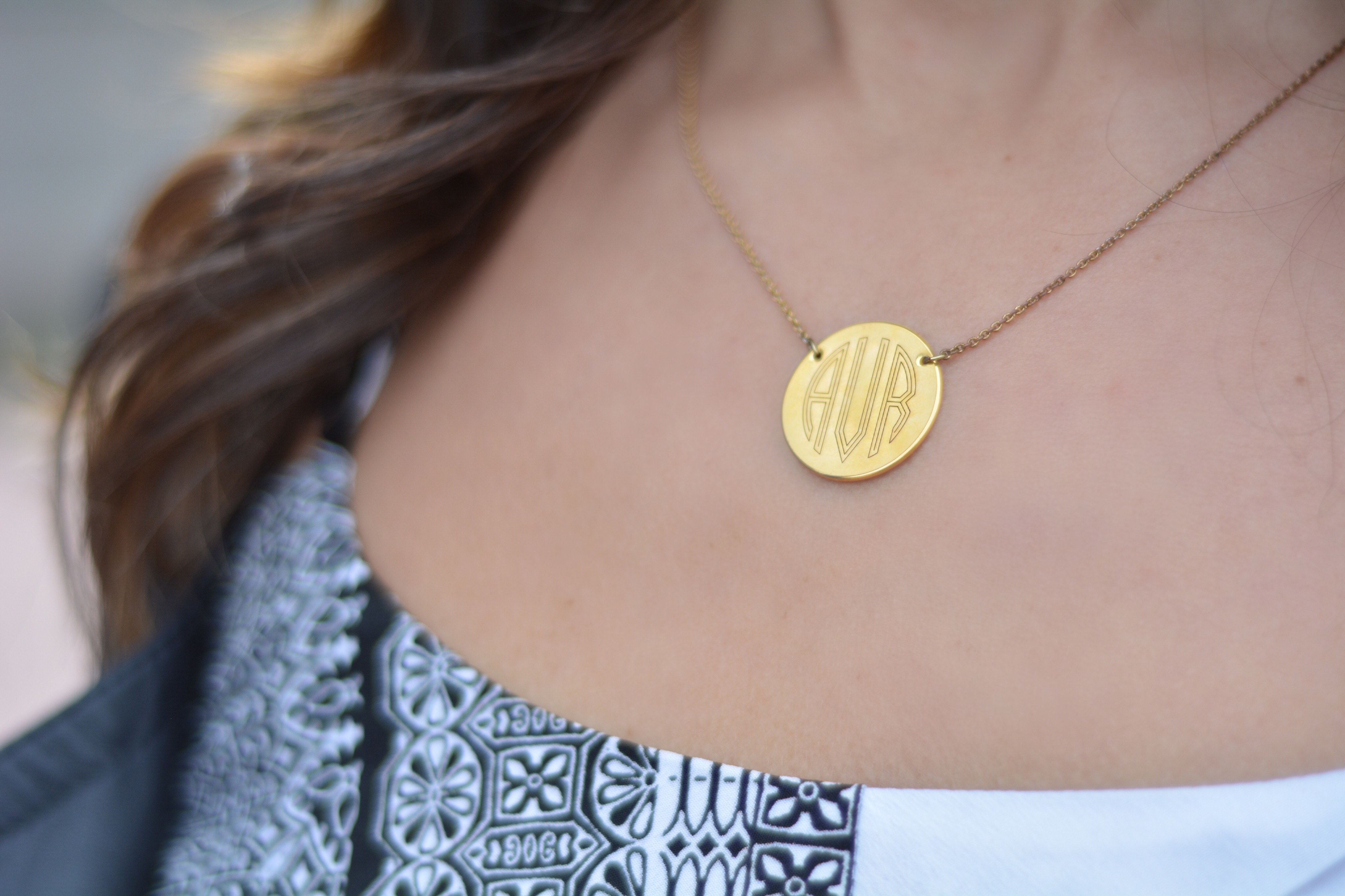 I went with the night out version. Paired with black strappy heels and my go to faux leather Forever 21 jacket. I’ve had this jacket for three years now. I’m obsessed. I’ll be so sad of the day our relationship comes to end. To top off the look I went with my standard everyday jewelry. My Stella and Dot engravable necklace I wear every day. Engraved with my Grandma’s initials so I can keep her close to my heart. I highly recommend this necklace to everyone. Stella and Dot has lots of engravables to choose from. Silver, gold, rose gold, bracelets, necklaces, etc. The options are endless. It’s the perfect gift to give as well. The bracelet is Gorjana and can be found on Rocksbox. I have a monthly membership with Rocksbox and this triangle bangle was sent to me this month. It compliments my Tory Burch Fitbit so well. This too I wear daily. I mean gotta keep them steps up.