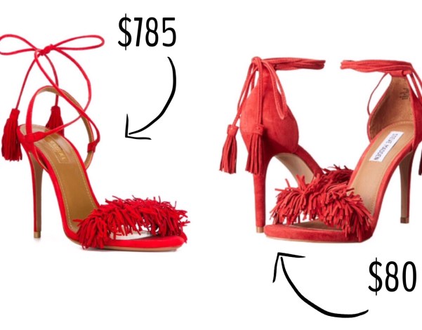 Have I mentioned that I LOVE 6pm.com? Well, I do! It’s the place that meets all your shoes needs. No matter what you’re looking for you can filter on 6pm to find the shoe that best fits you and your budget. These Aquazzura Wild Thing suede sandals are simply stunning. But, let’s be realistic there is no way I’m dropping $785 on shoes. What’s amazing about Steve Madden is they always stay in or ahead of the trend without having you break the bank. These $785 red suede fringed heels with wrap around ankle ties can be found on 6pm.com for just $80. Now that’s Trendy Not Spendy!