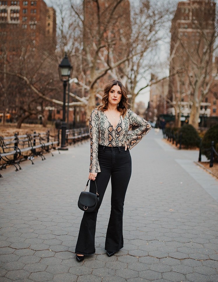 The pros of this bodysuit are simple…it is pretty decent quality for the cheap ass price, love me the low cut cleavage, and the bell sleeves make it oh so fun. The one and only con about this suit is that it’s all not one solid color or pattern. It’s black on the bottom and snakeskin on the top. So, with that said this body suit can only really work with high waisted black jeans like the pair in this post or with a high waisted skirt. I feel like that didn’t really sell this bodysuit, but I promise it’s worth the buy. Plus it’s only $7! It’s basically a Venti coffee from Starbucks.
