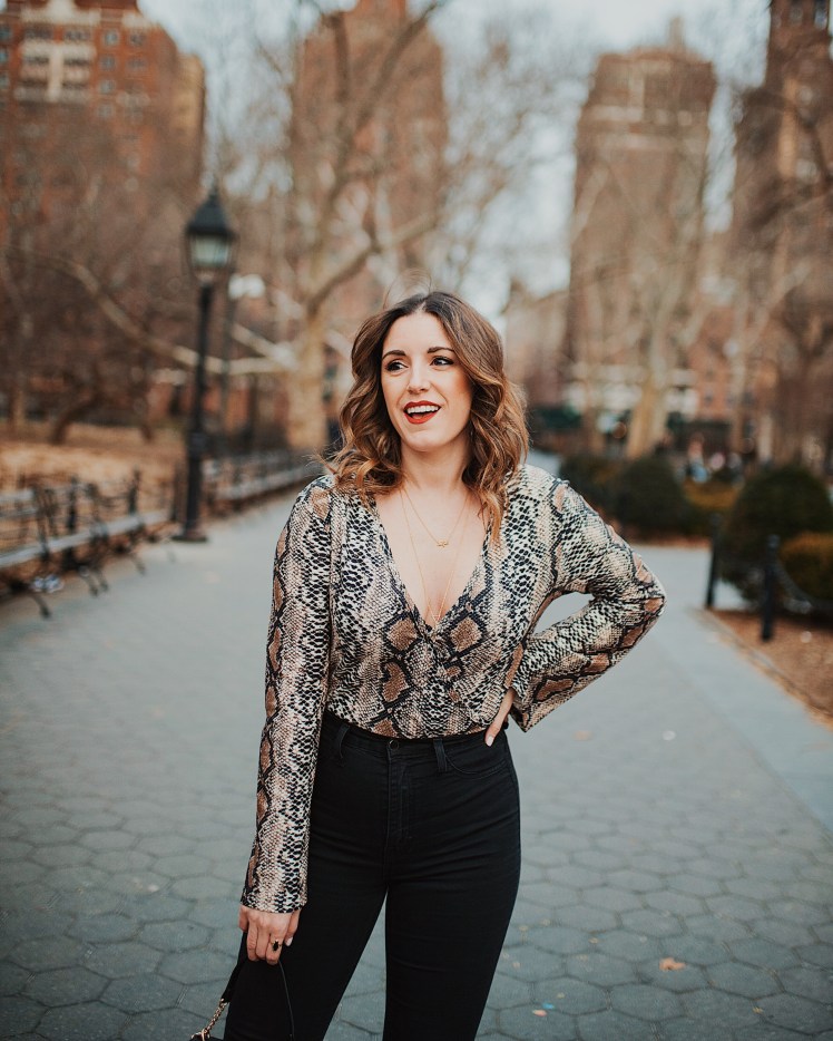 Do you ever purchase a piece of clothing and just wear it over and over again? That would be this snakeskin bodysuit I got from Sheinside this Christmas for $7 (yes $7!). I’ve always been a little nervous to wear a bodysuit. I’m just so scared that it will show every imperfection because it’s so tight. Luckily this bodysuit fits just right. Hmm…I just sounded like Goldilocks right there.